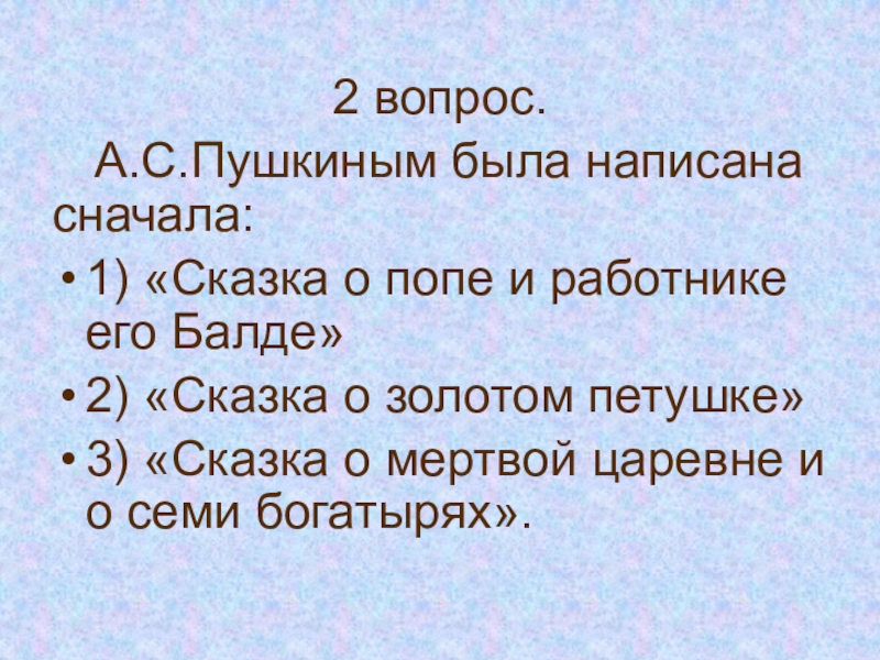 2 вопрос.  А.С.Пушкиным была написана сначала:1) «Сказка о попе и работнике его Балде»2) «Сказка о золотом