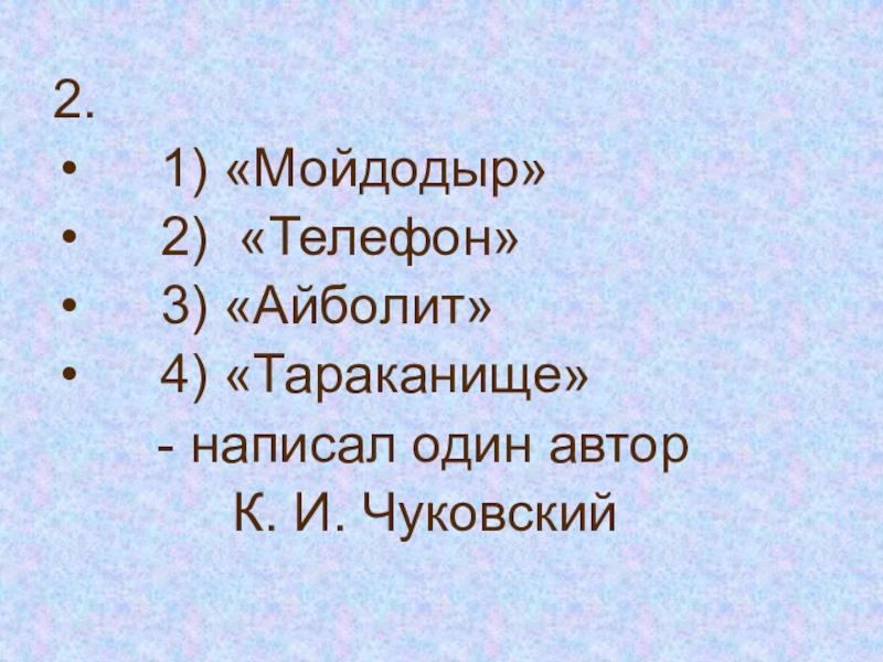 2.   1) «Мойдодыр»   2) «Телефон»   3) «Айболит»   4) «Тараканище»