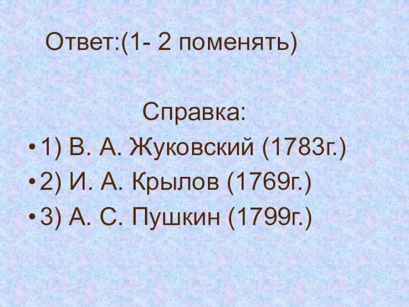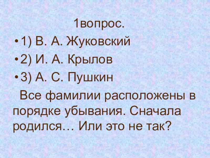 1вопрос.1) В. А. Жуковский 2) И. А. Крылов3)