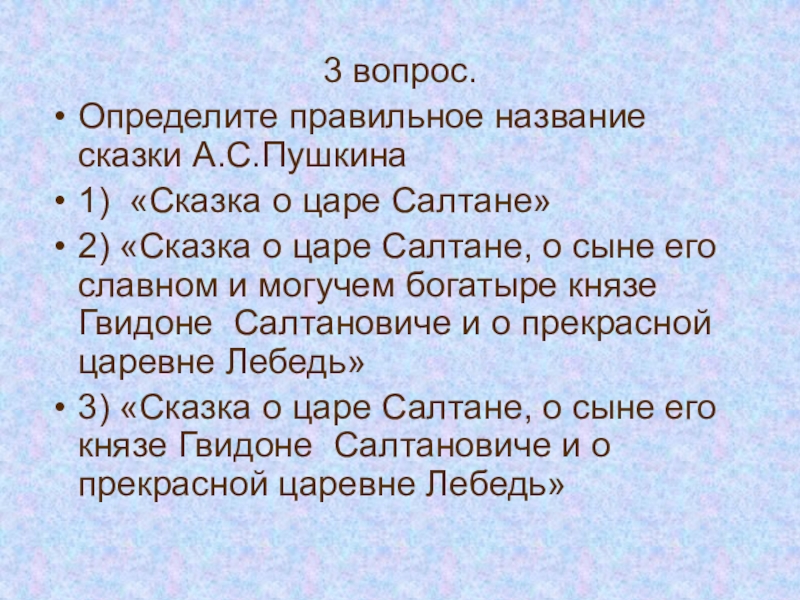 3 вопрос.Определите правильное название сказки А.С.Пушкина1) «Сказка о царе Салтане»2) «Сказка о царе Салтане, о сыне его