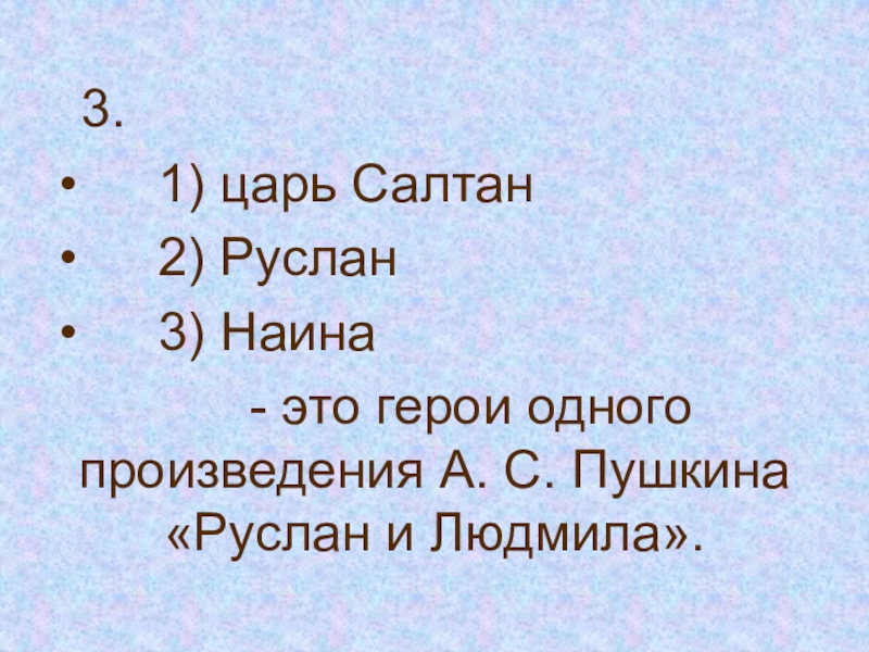 3.   1) царь Салтан   2) Руслан   3) Наина