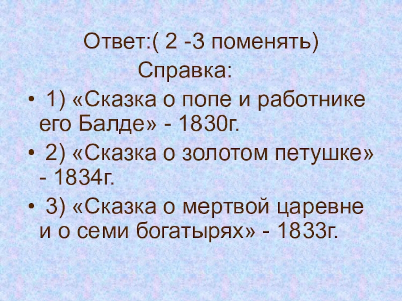 Ответ:( 2 -3 поменять)         Справка: 1) «Сказка о попе