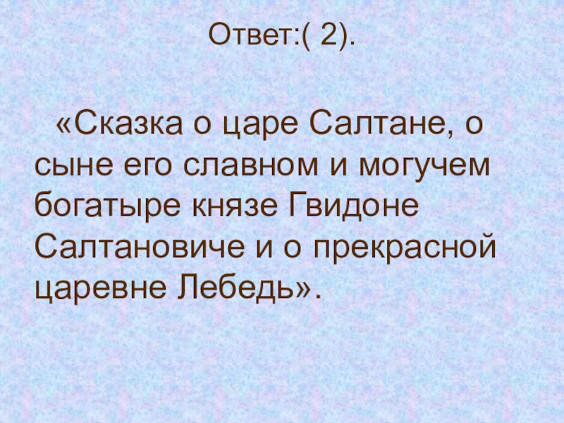 Ответ:( 2).   «Сказка о царе Салтане, о сыне его славном и могучем богатыре князе Гвидоне