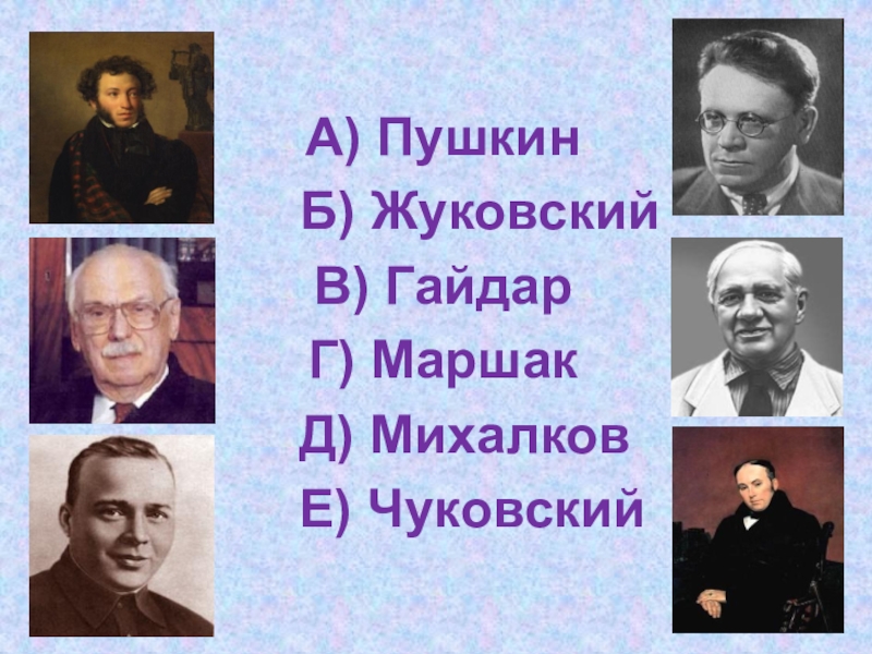 А) Пушкин   Б) ЖуковскийВ) ГайдарГ) Маршак  Д) Михалков  Е) Чуковский