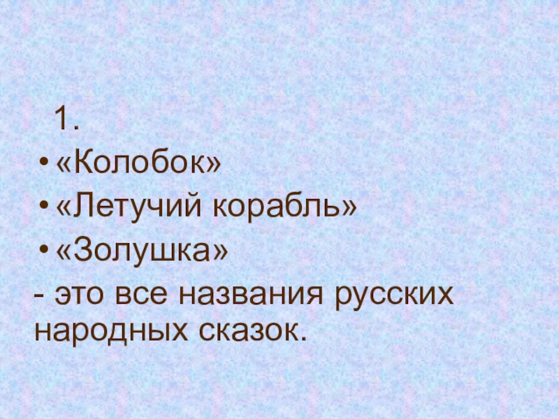 1.«Колобок»«Летучий корабль»«Золушка»- это все названия русских народных сказок.
