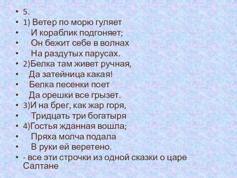 5. 1) Ветер по морю гуляет  И кораблик подгоняет;  Он бежит себе в волнах