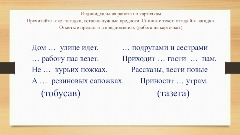 отгадайте загадки. Отметьте предлоги в предложениях (работа на карточках)