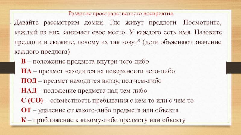 них занимает свое место. У каждого есть имя. Назовите предлоги и скажите, почему их так зовут? (дети объясняют значение каждого предлога)