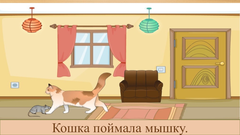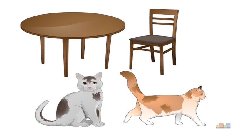 раздает карточки с изображением стола и стула. К карточке на нитке прикреплена кошка, вырезанная из картона.