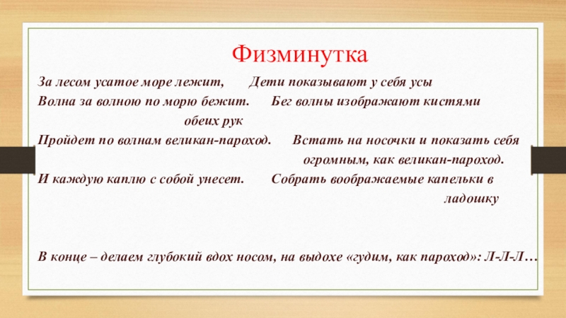 В конце – делаем глубокий вдох носом, на выдохе «гудим, как пароход»: Л-Л-Л…