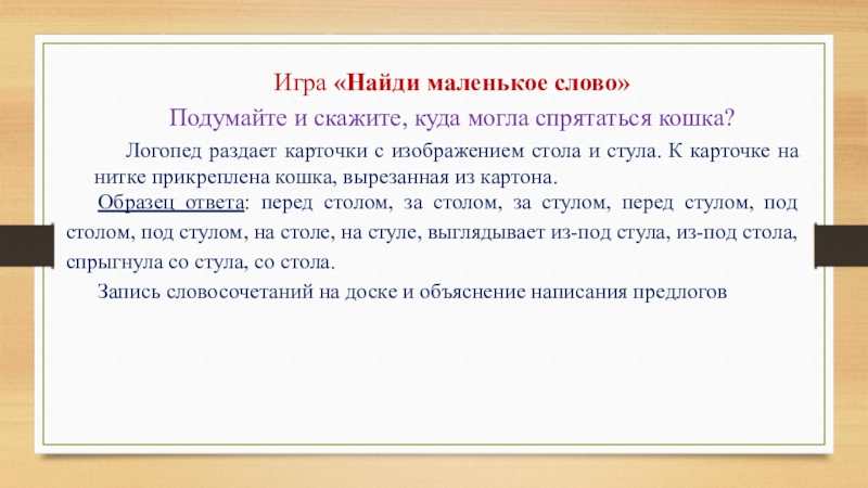 Образец ответа: перед столом, за столом, за стулом, перед стулом, под столом, под стулом, на столе, на стуле, выглядывает из-под стула, из-под стола, спрыгнула со стула, со стола.