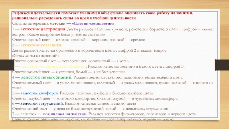 Слайд 39Рефлексия деятельности помогает учащимся объективно оценивать свою работу на занятии, рационально