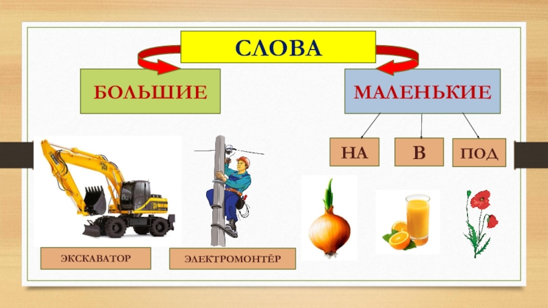 Слова могут быть различными: длинными – экскаватор, электромонтёр и короткими –лук, сок, на, мак, в, под.