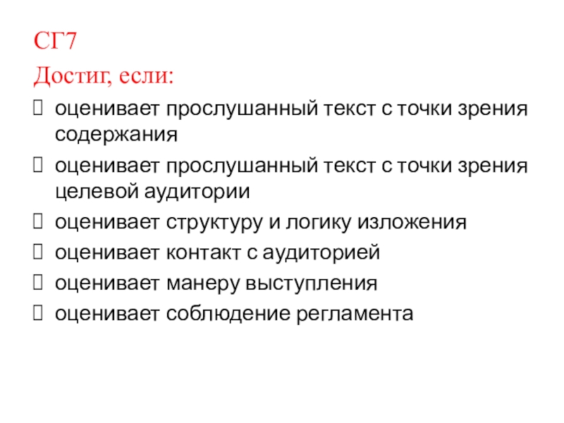 СГ7Достиг, если:оценивает прослушанный текст с точки зрения содержания	оценивает прослушанный текст с точки зрения целевой аудиторииоценивает структуру и