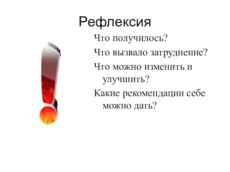 РефлексияЧто получилось?Что вызвало затруднение?Что можно изменить и улучшить?Какие рекомендации себе можно дать?