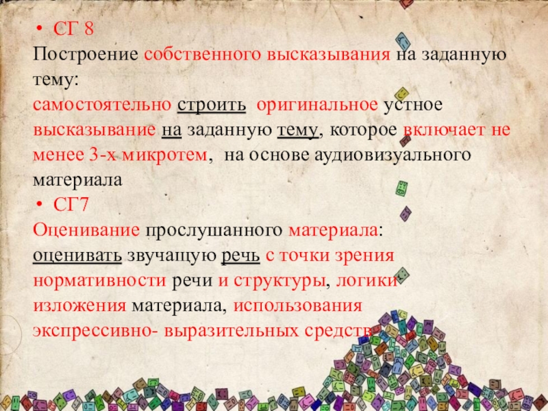 СГ 8Построение собственного высказывания на заданную тему:самостоятельно строить оригинальное устное высказывание на заданную тему, которое включает не