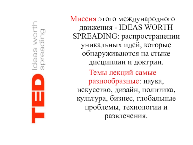 Слайд 7Миссия этого международного движения - IDEAS WORTH SPREADING: распространении уникальных идей,