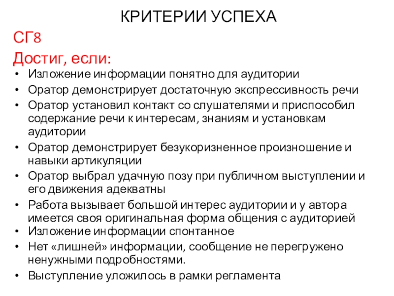 КРИТЕРИИ УСПЕХАСГ8Достиг, если:Изложение информации понятно для аудиторииОратор демонстрирует достаточную экспрессивность речиОратор установил контакт со слушателями и приспособил