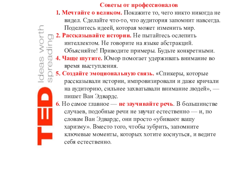 Конференции TED — это проект, посвященный «Идеям, Достойным Распространения» (Ideas Worth Spreading)
