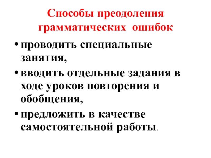 Способы преодоления грамматических ошибокпроводить специальные занятия, вводить отдельные задания в ходе уроков повторения и обобщения, предложить в