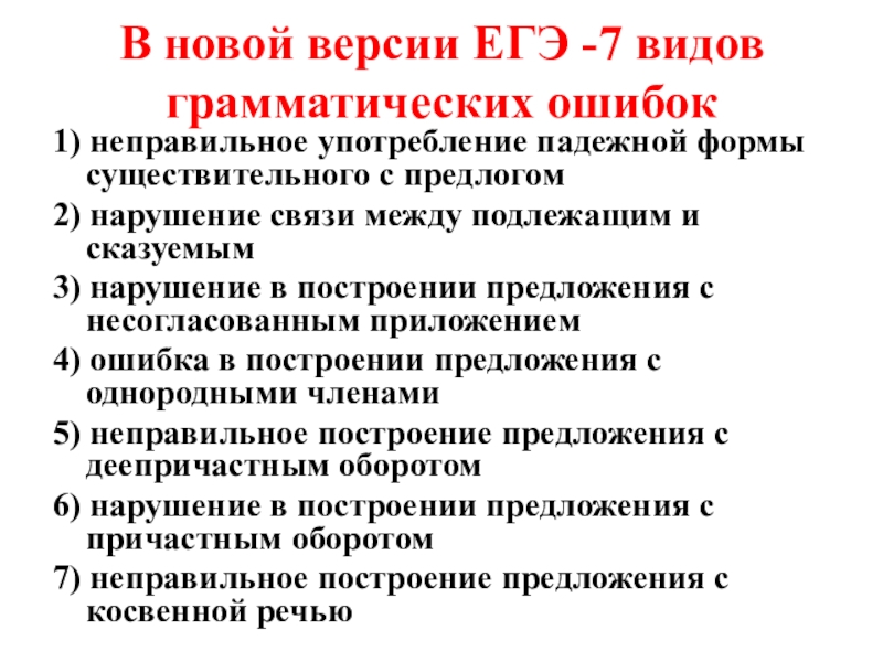 В новой версии ЕГЭ -7 видов грамматических ошибок1) неправильное употребление падежной формы существительного с предлогом2) нарушение связи