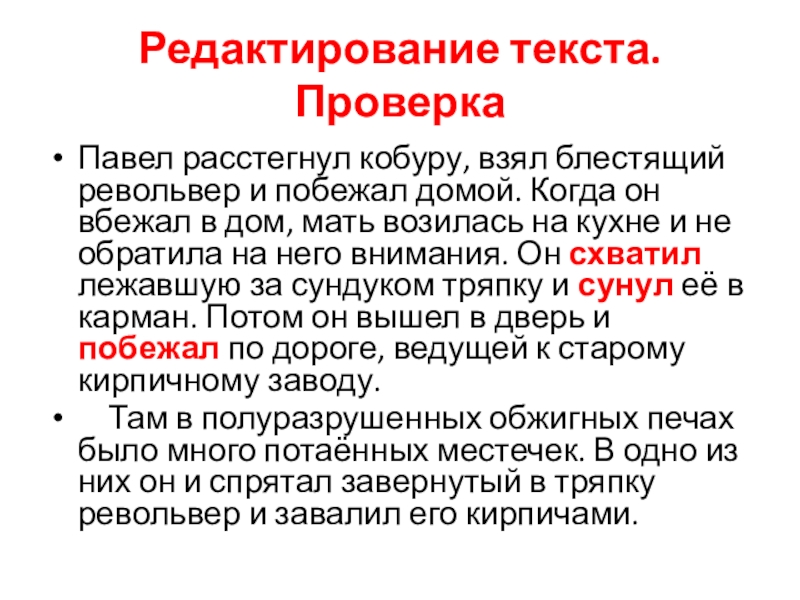 Редактирование текста. ПроверкаПавел расстегнул кобуру, взял блестящий револьвер и побежал домой. Когда он вбежал в дом, мать