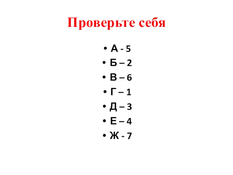 Проверьте себяА - 5Б – 2В – 6Г – 1Д – 3Е – 4Ж - 7