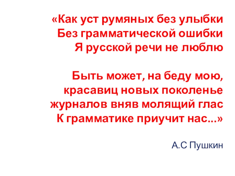 «Как уст румяных без улыбки Без грамматической ошибки Я русской речи не люблю Быть может, на беду мою, красавиц новых поколенье журналов вняв молящий глас К грамматике приучит нас...» А.С Пушкин
