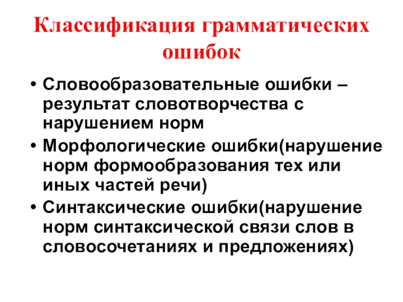Классификация грамматических ошибокСловообразовательные ошибки – результат словотворчества с нарушением нормМорфологические ошибки(нарушение норм формообразования тех или иных частей