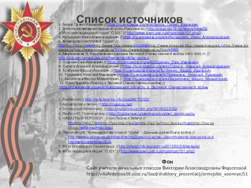 6. Песня из к/ф "Командир счастливой "Щуки" – Давным-давно была война // http://www.audiopoisk.com/track/no/mp3/pesni-o-voine---davnim-davno-bila-voina-iz-kf-komandir-s4astlivoi-6uki
