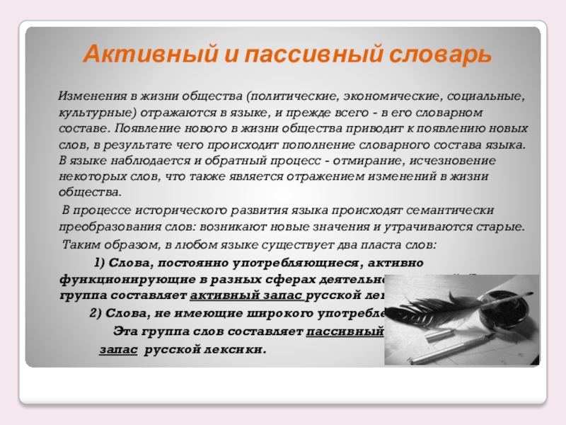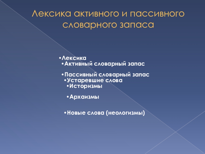 Слайд 28К пассивному запасу слов относятся такие, которые либо являются устаревшими, либо,