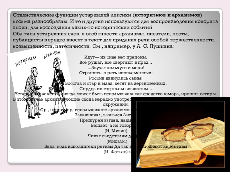 Слайд 30Стилистические функции устаревшей лексики (историзмов и архаизмов) весьма разнообразны. И те