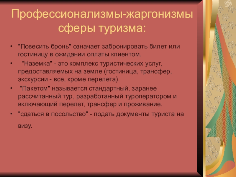 Слайд 16Профессионализмы-жаргонизмы сферы туризма: