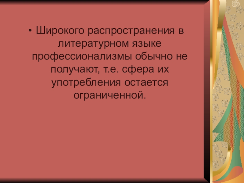 Слайд 14Широкого распространения в литературном языке профессионализмы обычно не получают, т.е. сфера