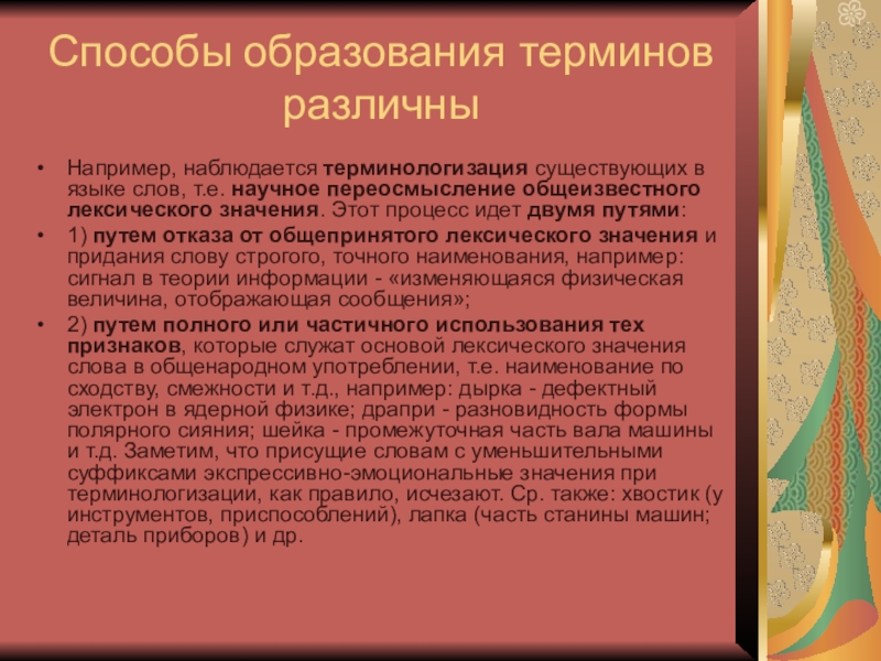 1) путем отказа от общепринятого лексического значения и придания слову строгого, точного наименования, например: сигнал в теории информации - «изменяющаяся физическая величина, отображающая сообщения»;