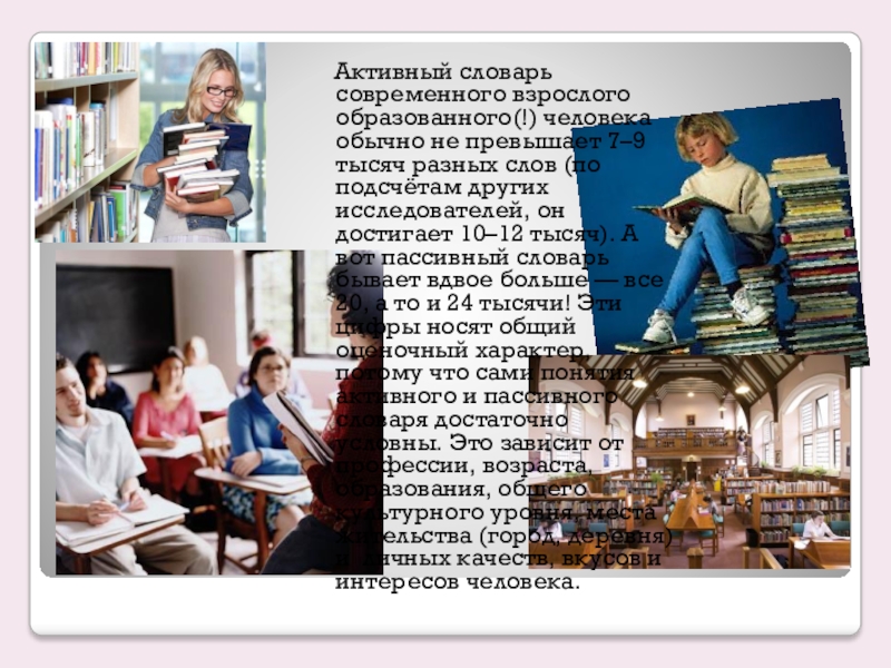 7–9 тысяч разных слов (по подсчётам других исследователей, он достигает 10–12 тысяч). А вот пассивный словарь бывает вдвое больше — все 20, а то и 24 тысячи! Эти цифры носят общий оценочный характер, потому что сами понятия активного и пассивного словаря достаточно условны. Это зависит от профессии, возраста, образования, общего культурного уровня, места жительства (город, деревня) и личных качеств, вкусов и интересов человека.