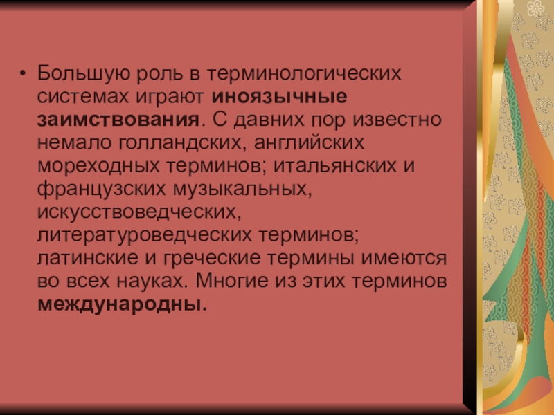 Слайд 21Большую роль в терминологических системах играют иноязычные заимствования. С давних пор