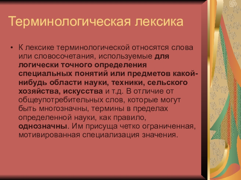 К лексике терминологической относятся слова или словосочетания, используемые для логически