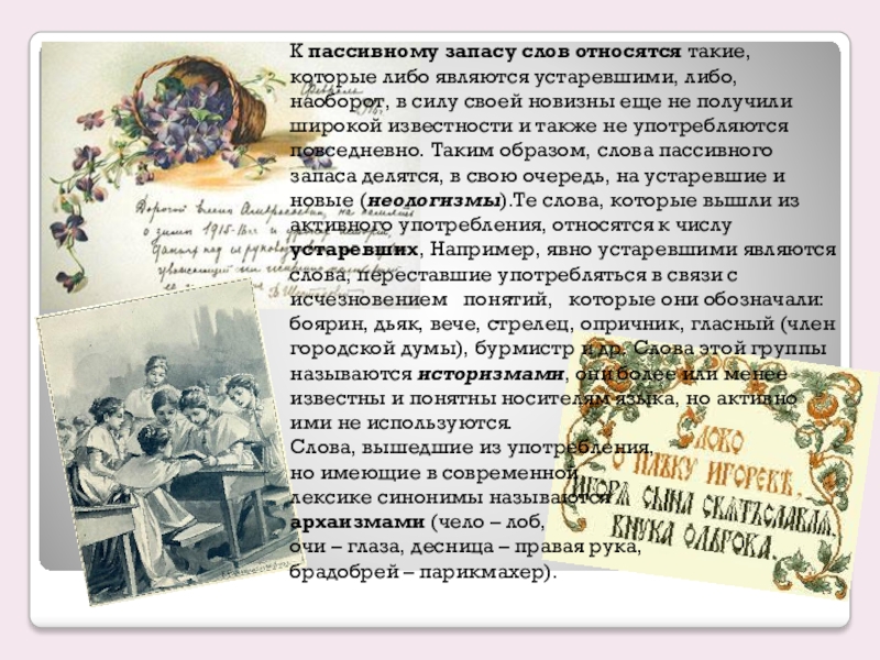 наоборот, в силу своей новизны еще не получили широкой известности и также не употребляются повседневно. Таким образом, слова пассивного запаса делятся, в свою очередь, на устаревшие и новые (неологизмы).Те слова, которые вышли из активного употребления, относятся к числу устаревших, Например, явно устаревшими являются слова, переставшие употребляться в связи с исчезновением понятий, которые они обозначали: боярин, дьяк, вече, стрелец, опричник, гласный (член городской думы), бурмистр и др. Слова этой группы называются историзмами, они более или менее известны и понятны носителям языка, но активно ими не используются.