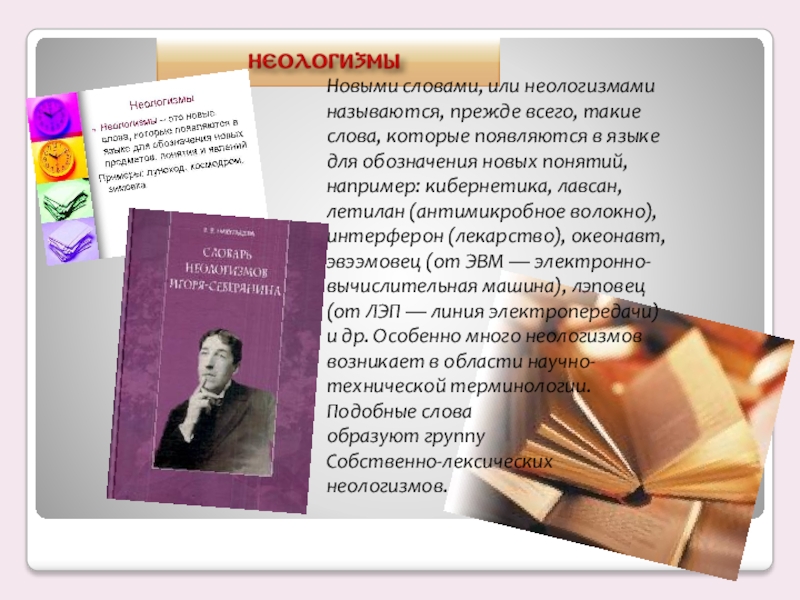 в языке для обозначения новых понятий, например: кибернетика, лавсан, летилан (антимикробное волокно), интерферон (лекарство), океонавт, эвээмовец (от ЭВМ — электронно-вычислительная машина), лэповец (от ЛЭП — линия электропередачи) и др. Особенно много неологизмов возникает в области научно-технической терминологии. Подобные слова
