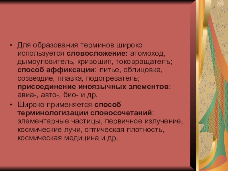Слайд 20Для образования терминов широко используется словосложение: атомоход, дымоуловитель, кривошип, токовращателъ; способ