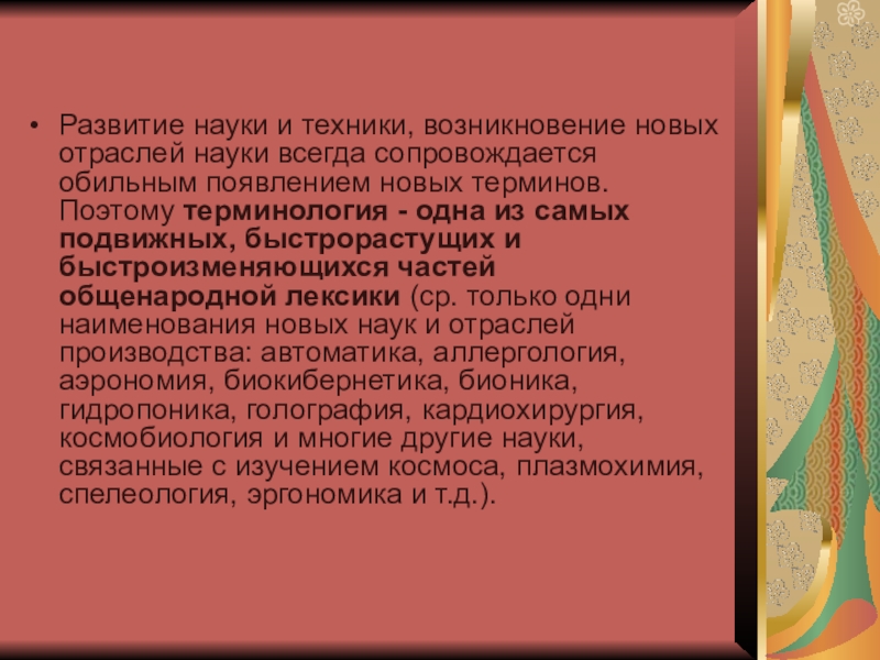 Слайд 18Развитие науки и техники, возникновение новых отраслей науки всегда сопровождается обильным