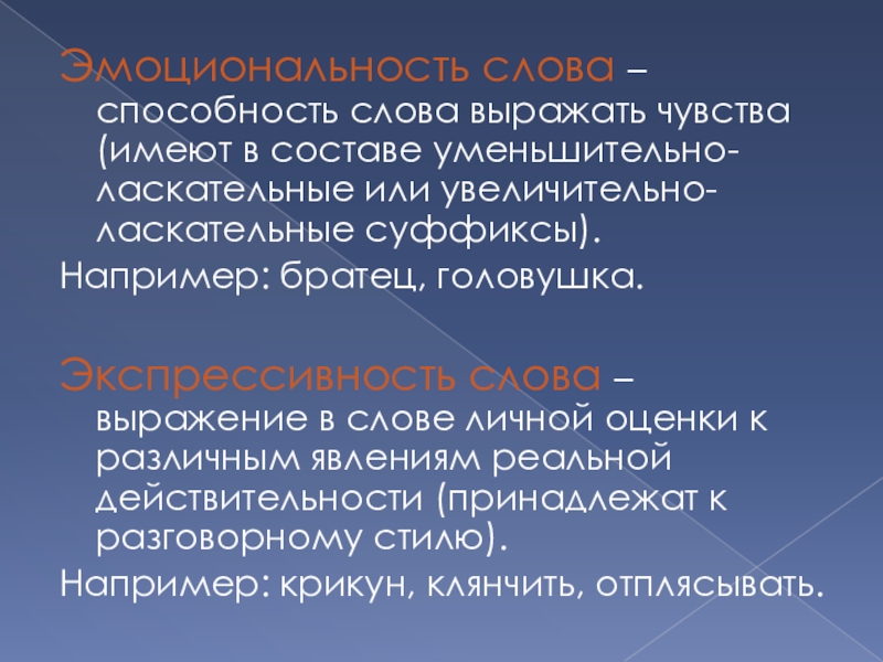 Слайд 5Эмоциональность слова – способность слова выражать чувства (имеют в составе уменьшительно-ласкательные