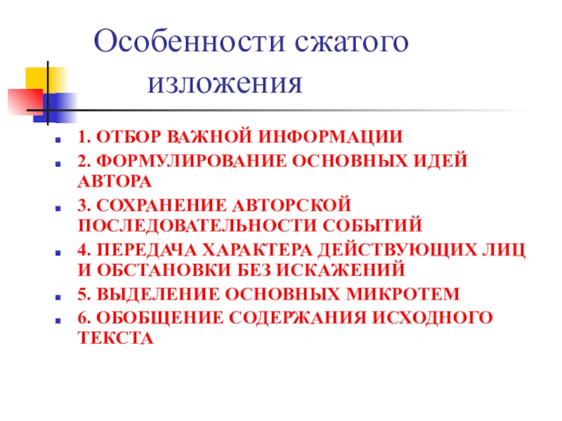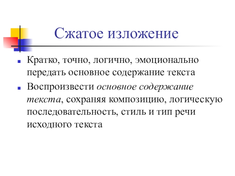 Воспроизвести основное содержание текста, сохраняя композицию, логическую последовательность, стиль и тип речи исходного текста