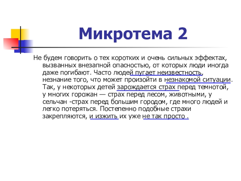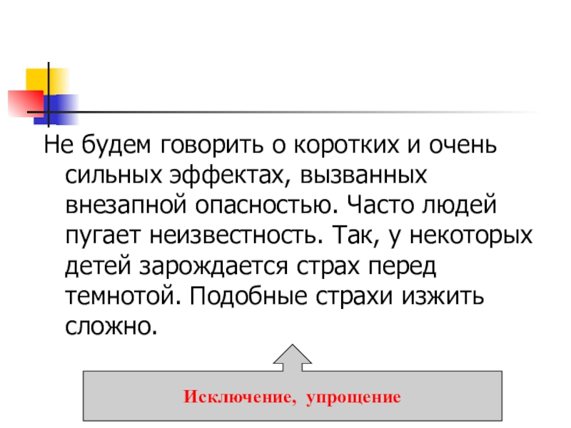 опасностью. Часто людей пугает неизвестность. Так, у некоторых детей зарождается страх перед темнотой. Подобные страхи изжить сложно.