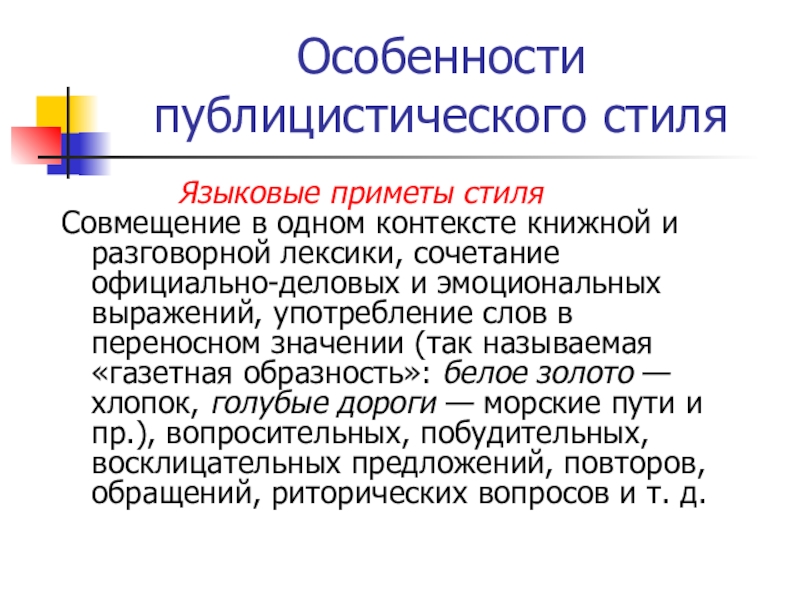 одном контексте книжной и разговорной лексики, сочетание официально-деловых и эмоциональных выражений, употребление слов в переносном значении (так называемая «газетная образность»: белое золото — хлопок, голубые дороги — морские пути и пр.), вопросительных, побудительных, восклицательных предложений, повторов, обращений, риторических вопросов и т. д.