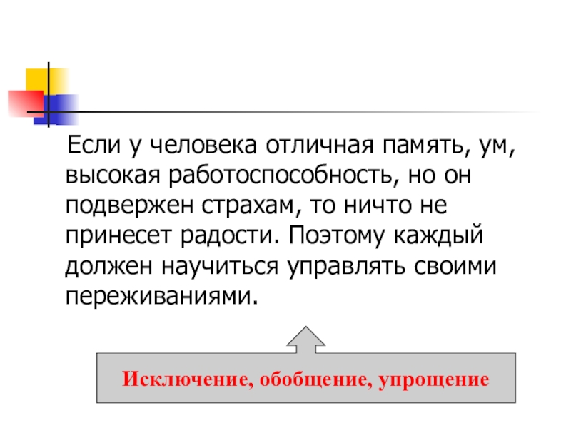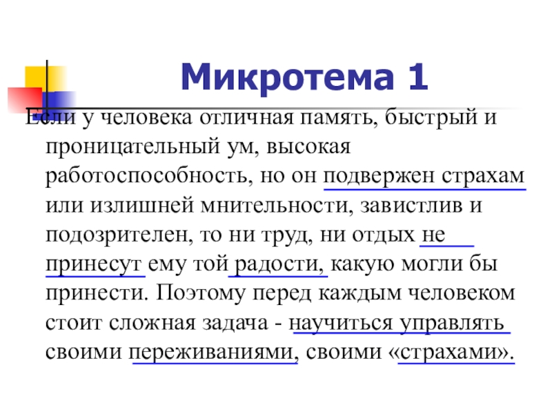 работоспособность, но он подвержен страхам или излишней мнительности, завистлив и подозрителен, то ни труд, ни отдых не принесут ему той радости, какую могли бы принести. Поэтому перед каждым человеком стоит сложная задача - научиться управлять своими переживаниями, своими «страхами».