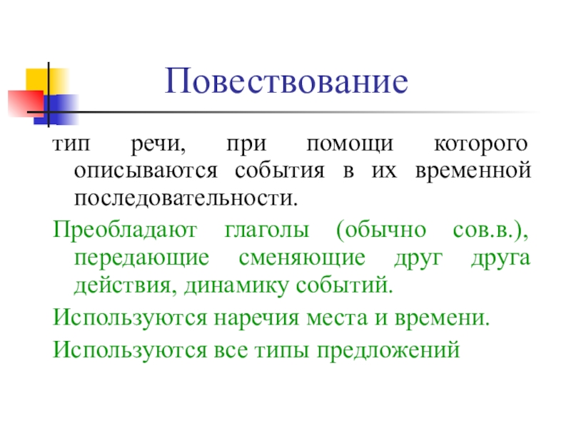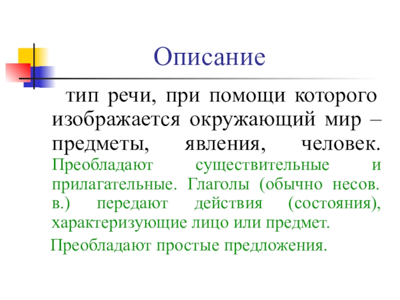 речи, при помощи которого изображается окружающий мир – предметы, явления, человек. Преобладают существительные и прилагательные. Глаголы (обычно несов.в.) передают действия (состояния), характеризующие лицо или предмет.