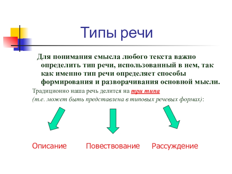 смысла любого текста важно определить тип речи, использованный в нем, так как именно тип речи определяет способы формирования и разворачивания основной мысли.