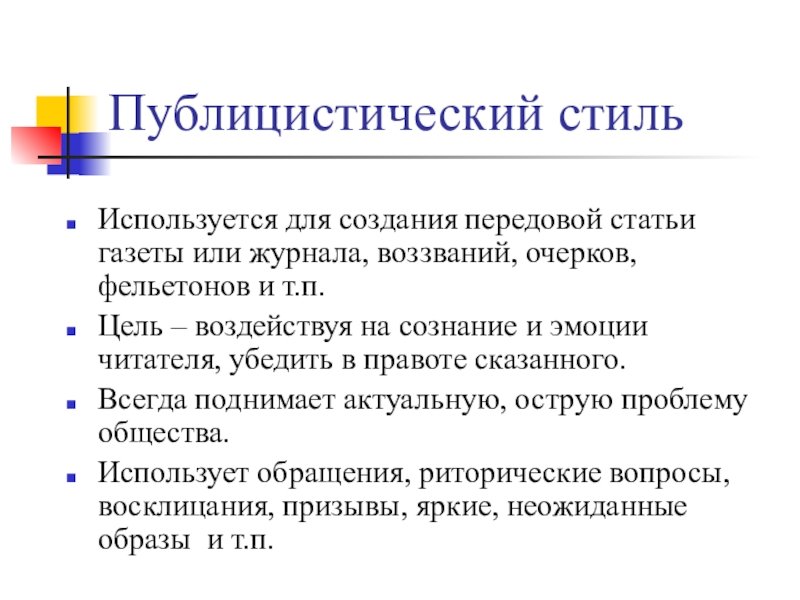 Используется для создания передовой статьи газеты или журнала, воззваний, очерков,